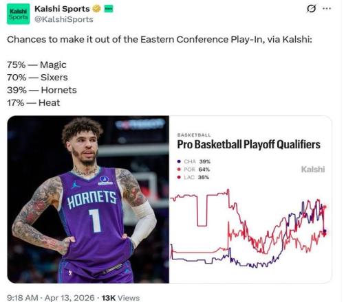 只不過,美媒并不看好黃蜂逆襲,知名預測平臺Kalshi Sports曬出4支附加賽球隊晉級季后賽的可能性,其中第七的魔術75%領跑,第八的76人也有70%,第九的黃蜂僅為39%,熱火更是低至17%。