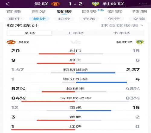 體育播報(bào)4月14日宣 在本輪英超,曼聯(lián)1-2不敵利茲聯(lián),以下為雙方全場(chǎng)數(shù)據(jù)對(duì)比: