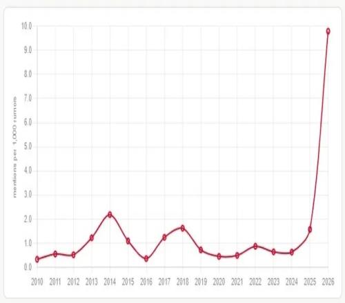 這張折線圖展示了在2010年至2026年間,關(guān)鍵詞“擺爛”在每1000條謠言中的提及次數(shù)的變化趨勢(shì)。