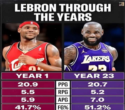 今日美媒公布了一組關(guān)于勒布朗·詹姆斯的數(shù)據(jù)對(duì)比:18歲的詹姆斯vs41歲的詹姆斯。