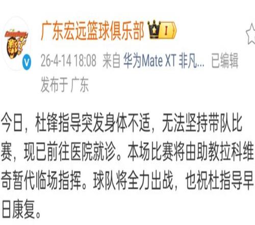 雖然很多球迷喊杜鋒下課,但廣東宏遠顯然不會這樣做,然而就在主場和寧波富邦比賽前,杜鋒身體出現(xiàn)了問題,廣東宏遠官方也進行了公告,拉科維奇成為臨時主帥帶隊比賽。