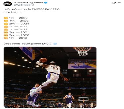 湖人官方在這一天還曬出了勒布朗本賽季場均快攻5.7分聯(lián)盟第一,今年12月就要年滿42歲的老將在這項數(shù)據(jù)上還能獨占鰲頭足以證明他仍在巔峰。