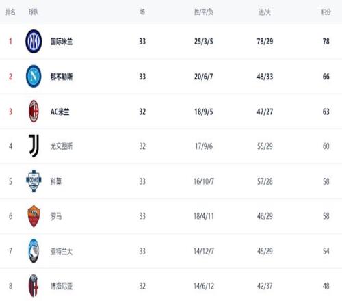 在積分榜上,國(guó)際米蘭以78分高居榜首,戰(zhàn)績(jī)是25勝3平5負(fù)。那不勒斯輸球之后,依然是66分,被國(guó)際米蘭甩開(kāi)12分。冠軍歸屬基本失去了懸念。AC米蘭以63分排名第3。第4的是尤文圖斯,拿到60分。科莫58分,排名第5。羅馬戰(zhàn)平亞特蘭大之后,也是58分,排名第6,與歐冠區(qū)有2分的差距。亞特蘭大54分,排名第7。