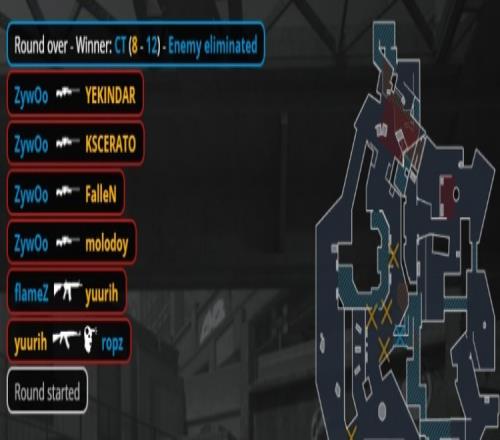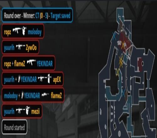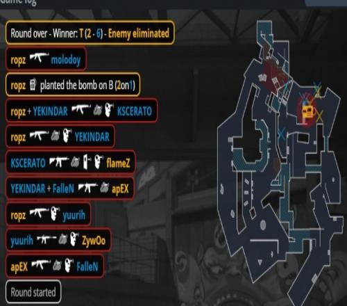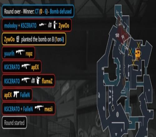 第7回合ropz長(zhǎng)管換掉教父,mezii進(jìn)B打掉yuurih,Zywoo轟掉卡神,小蜜蜂拿到首分。