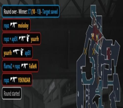 第22回合,下水道卡神長(zhǎng)管混煙打掉mezii,molodoy來A大轟掉ropz,Zywoo繼續(xù)轟掉molodoy,apex埋伏廁所近大遠(yuǎn)小雙殺yuurih與教父,Zywoo出下水道被工地卡神打掉,殘局2v2,卡神與狂哥進(jìn)B打掉apex下包得手,火仔三樓上被燒保槍,黑豹拿到第10分,小蜜蜂喊出暫停。
