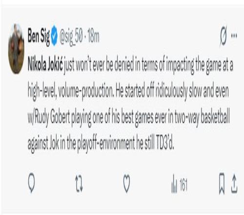 掘金記者Ben Sig寫道:約基奇在高水平的季后賽中影響比賽方面依舊無人能擋,他在開局非常慢熱的情況下也碾碎的了戈貝爾,說實話戈貝爾已經(jīng)打出他生涯最好的攻防表現(xiàn),可約基奇還是拿到了三雙。