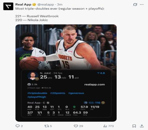 4.約基奇常規(guī)賽+季后賽三雙合計已經(jīng)達到220大關(guān),距離威少只差1次;