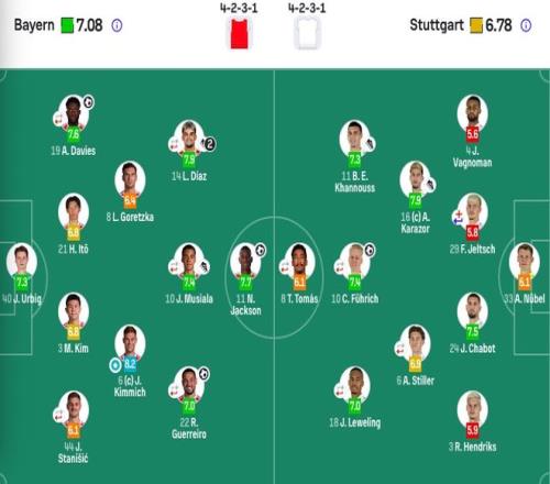 拜仁首發(fā):40-烏爾比希、3-金玟哉、19-阿方索·戴維斯(62' 27-萊默爾)、21-伊藤洋輝、22-格雷羅(76' 39-恩迪亞耶)、44-斯坦尼西奇、6-基米希、8-格雷茨卡、10-穆西亞拉(46' 9-凱恩)、11-杰克遜、14-迪亞斯(46' 17-奧利塞)