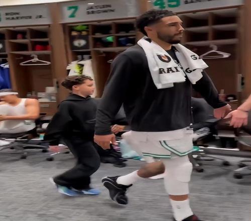 在比賽結(jié)束后在球館內(nèi)接受了球迷們歡呼的綠凱球員們緩緩地回到更衣室,塔圖姆帶著自己的兒子Deuce進(jìn)入更衣室等待主帥馬祖拉的復(fù)盤。Deuce早就是綠凱更衣室的???。
