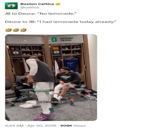 杰倫-布朗是最后一個(gè)進(jìn)入更衣室的,布朗與隊(duì)友們一一擊掌后來到Deuce的跟前,布朗逗趣Deuce,他說道“我們沒有檸檬水了!”Deuce回答“我已經(jīng)喝過檸檬水了?!薄緩倪@一點(diǎn)就能看出雙探花的感情非常之好】