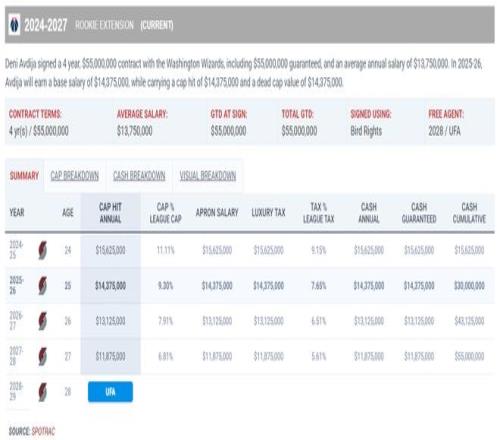 阿夫迪亞4年5500萬的合同還是遞減合同,本賽季只有1437萬,下賽季1312萬,27-28賽季1187萬。2024年6月7日開拓者用布羅格登、2024年14號(hào)簽、2029年首輪、2個(gè)次輪簽從奇才換來阿夫迪亞,不得不說這筆5換1的交易贏麻了。
