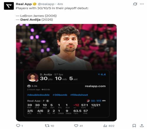 這場比賽對(duì)于阿夫迪亞來說是生涯之夜,他季后賽首秀拿到30+10+5,他比肩詹姆斯季后賽首秀,他是詹皇06年后首位季后賽首秀30+10+5的球員。