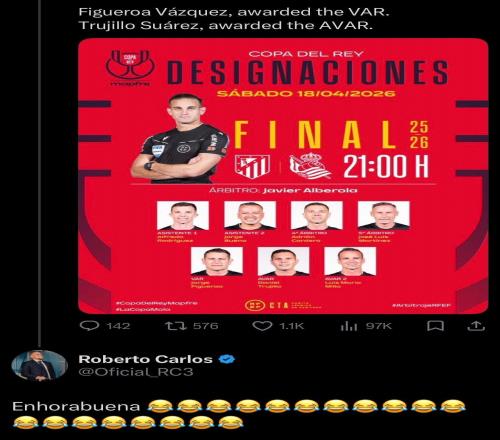 北京時(shí)間4月14日,皇馬球星羅伯托-卡洛斯在社交媒體上用一句“恭喜啊”配以連續(xù)笑哭表情,諷刺西班牙足協(xié)任命阿爾貝羅拉-羅哈斯執(zhí)法國王杯決賽。西班牙足協(xié)已任命阿爾貝羅拉-羅
