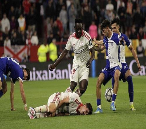 北京時間4月12日,西甲第31輪,塞維利亞主場對陣馬競。比賽中。圖源:視覺中國上半場第10分鐘,羅梅羅造點,亞當斯主罰點球命中,塞維利亞1-0馬競。第35分鐘,博尼亞爾頭球沖頂破門,塞維利