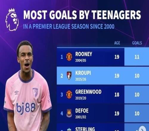 北京時(shí)間4月13日,在克魯皮用進(jìn)球幫助伯恩茅斯本輪英超客場(chǎng)2-1爆冷擊敗領(lǐng)頭羊阿森納之后,來(lái)自德轉(zhuǎn)的統(tǒng)計(jì)指出,這位現(xiàn)年19歲的法國(guó)新星有望打破由魯尼保持的英超自2000年以來(lái)U20