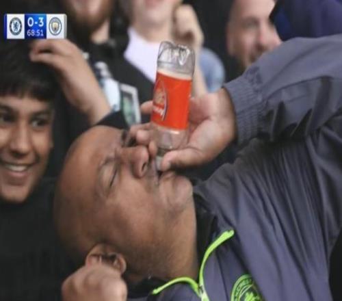 吹阿森納水瓶的球迷:瓶子是以前口渴時(shí)找槍手替補(bǔ)席要的