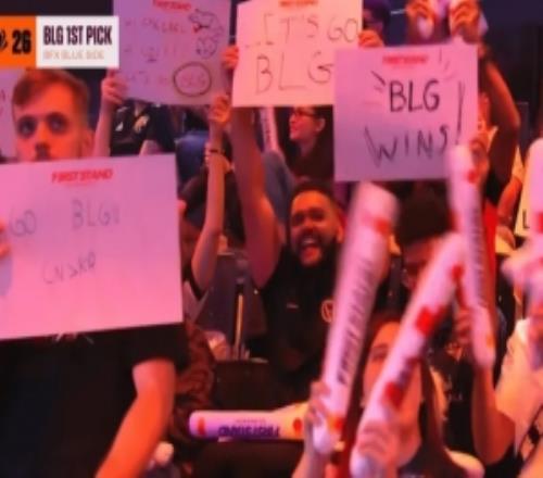 電競(jìng)體育3月16報(bào)道 先鋒賽首日BLG對(duì)陣BFX,巴西主場(chǎng)許多觀眾舉著B(niǎo)LG應(yīng)援牌為其...