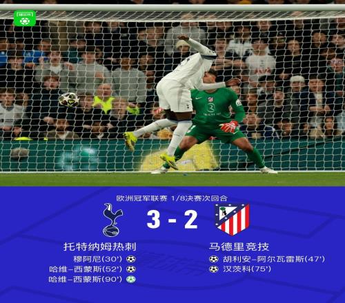 歐冠1/8決賽次回合的一場較量中,托特納姆熱刺主場3-2擊敗馬德里競技,但首回合2-5告負(fù)讓他們?nèi)砸?-7的總比分被...
