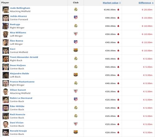 西甲身價(jià)跌幅榜:貝林厄姆2000萬(wàn)歐居首,小蜘蛛、羅德里戈、加維1000萬(wàn)歐