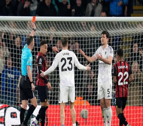 馬奎爾禁區(qū)內(nèi)防守時(shí)推倒埃瓦尼爾森,當(dāng)值裁判出示紅牌,曼聯(lián)此后十人應(yīng)戰(zhàn),未能全取三分。十人曼聯(lián)2比2伯恩茅斯,裁...