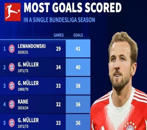 德甲單賽季進(jìn)球榜:萊萬(wàn)41球第1,凱恩本賽季24場(chǎng)30球第11位