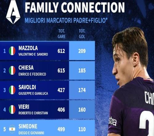 意甲歷史父子進(jìn)球榜:基耶薩父子第2,西蒙尼父子第5