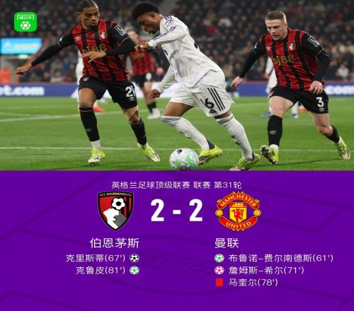 北京時(shí)間3月21日英格蘭足球頂級(jí)聯(lián)賽 聯(lián)賽 第31輪,伯恩茅斯主場(chǎng)對(duì)陣曼聯(lián)。伯恩茅斯克里斯蒂破門(mén),克魯皮破門(mén),詹...