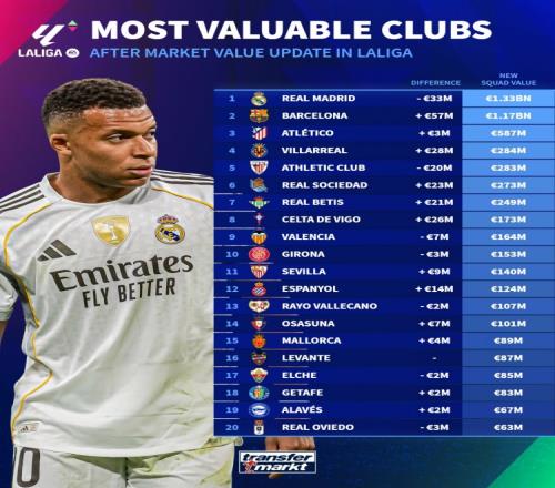 西甲球隊(duì)身價風(fēng)云變幻巴薩飆升5700萬歐皇馬卻降3300萬歐_西甲直播