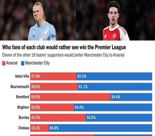 The Athletic對(duì)英超18支球隊(duì)的球迷發(fā)起調(diào)查:你支持誰贏得英超冠軍?阿森納還是曼城?最終,11家球迷更支持曼城,7家...