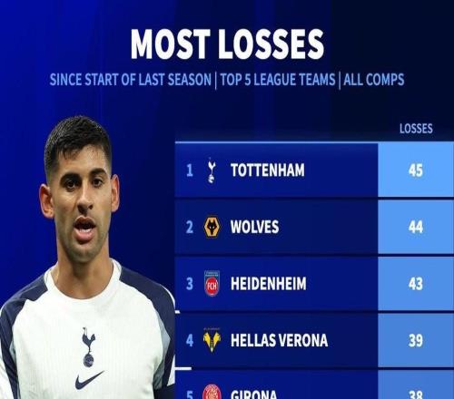 根據(jù)德轉(zhuǎn)的數(shù)據(jù)統(tǒng)計,熱刺上賽季以來各項賽事輸?shù)?5場,是五大聯(lián)賽最多的球隊。上賽季以來五大聯(lián)賽球隊輸球榜(各...