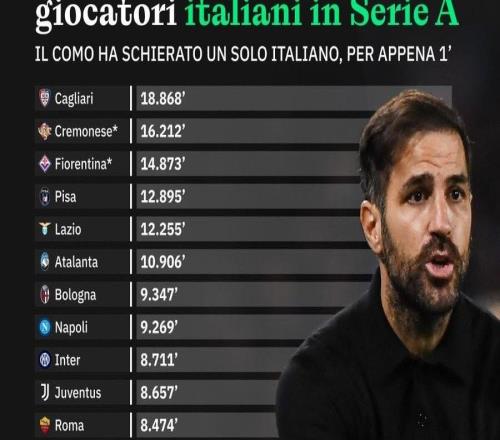 本賽季意甲20隊(duì)意大利球員出場(chǎng)時(shí)間排行榜:科莫1分鐘墊底