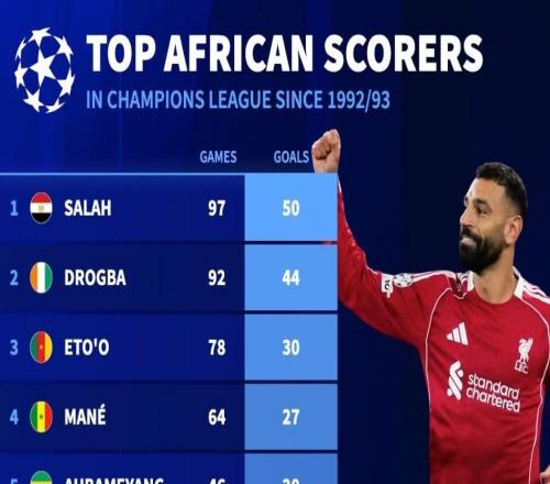 歐冠非洲球員歷史射手榜:薩拉赫50球第1,德羅巴44球第2