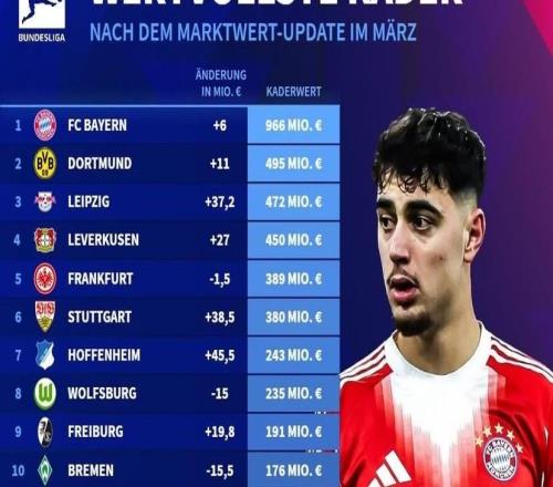 德甲球員的身價(jià)再次迎來(lái)了更新,在德轉(zhuǎn)發(fā)布的最新身價(jià)排行榜上,拜仁依然是德甲身價(jià)最高的球隊(duì),在身價(jià)排行前10的...