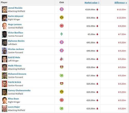 德甲球員身價(jià)跌幅榜:穆西亞拉、阿德耶米1000萬(wàn)歐居首