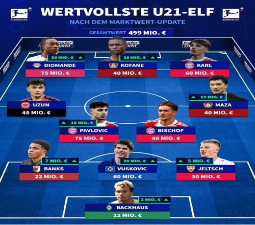 德甲最貴U21陣容:迪奧曼德、帕夫洛維奇、卡爾、馬扎在列