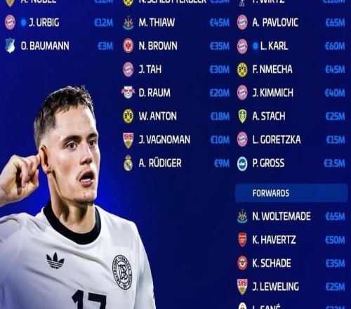 新一期德國隊(duì)身價(jià)榜:維爾茨1.1億第1,沃爾特馬德6500萬第2