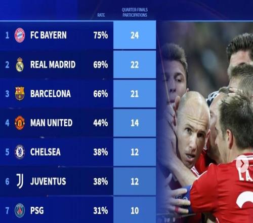 9495賽季至今歐冠8強(qiáng)晉級次數(shù):拜仁24次第1,曼聯(lián)第4
