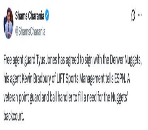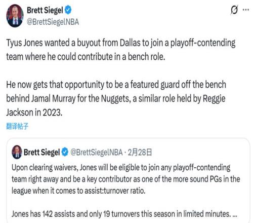名記Siegel跟進(jìn)報道稱,瓊斯與獨行俠達(dá)成買斷,是想加盟一支具備季后賽競爭力的球隊,并在球隊中擔(dān)任替補貢獻(xiàn)者。如今他得到了這樣的機會 —— 將在掘金擔(dān)任賈馬爾-穆雷身后的主要替補后衛(wèi),這與2023年雷吉-杰克遜在掘金的角色相似。