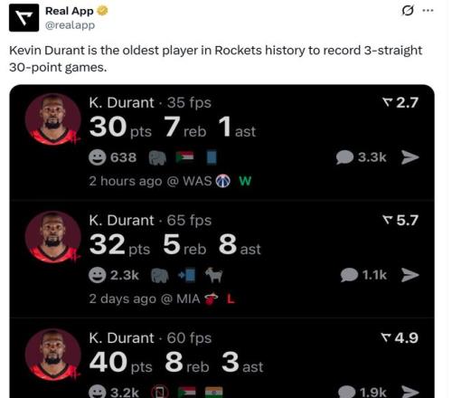 憑借這樣的表現(xiàn),杜蘭特已經(jīng)連續(xù)三場(chǎng)轟下30+得分表現(xiàn),分別是30分、32分和40分,三場(chǎng)合砍102分,讓37歲155天的杜蘭特成為火箭隊(duì)史創(chuàng)造這一壯舉最老的球員。