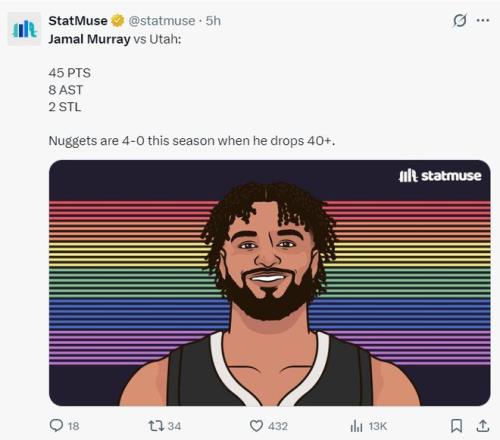 他在第三節(jié)三分7中5拿到18分1搶斷,末節(jié)2中2+罰球6中6拿到10分,整個(gè)下半場(chǎng)拿到28分。而約基奇全場(chǎng)比賽只拿到22分12籃板5助攻,此役掘金就是靠穆雷才拿下的。