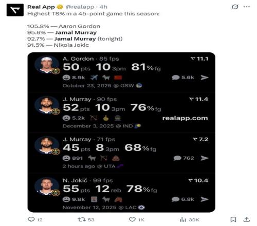 3.掘金本賽季拿到45分以上真實(shí)命中率超過(guò)90%的球員有三人:約基奇、穆雷(2次)、戈登;