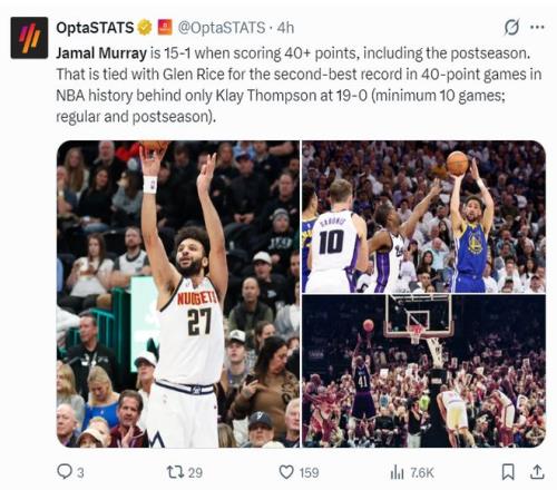 4.本賽季穆雷拿到4次40+,掘金則拿到4勝0負(fù);