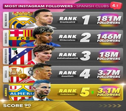 C羅收購阿爾梅里亞后球隊社媒粉絲數(shù)飆升,躍升至西班牙第五