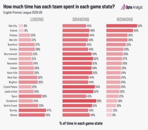 同時,這也是阿森納本賽季聯(lián)賽里最長的一次單場拖延時長。他們本場的拖延時間占總比賽時長的30.6%,在2025-26賽季所有英超球隊中排名第11。