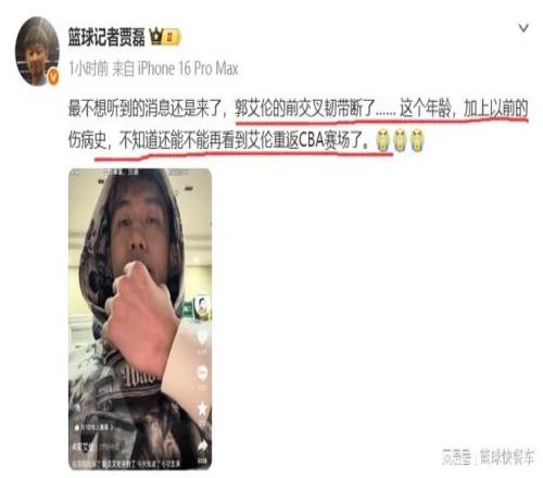 賽后,經(jīng)過醫(yī)院的診斷,郭艾倫的傷情終于出來了。根據(jù)最新消息,郭艾倫是前交叉韌帶斷了。作為一個(gè)33歲的老將,這是他最不愿意碰上的傷病。按照目前的狀況,郭艾倫本賽季大概率是回不來了。有知情人士透露,郭艾倫這個(gè)傷病康復(fù)周期比較長,大概率是一年。這也就意味著,郭艾倫已經(jīng)提前賽季報(bào)銷了。另外,以郭艾倫目前的狀態(tài)和傷勢,他是否能夠重返CBA,還真是一個(gè)未知數(shù)。