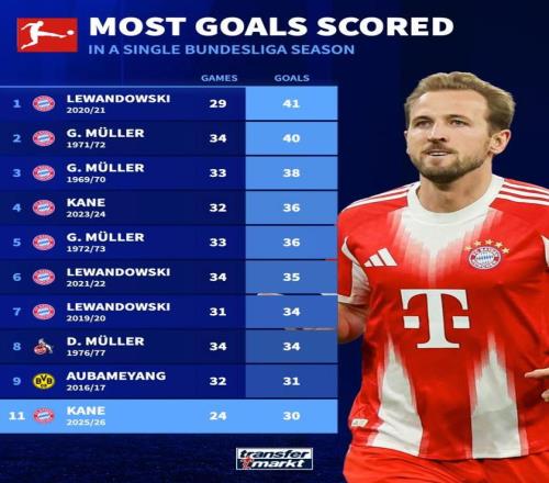 德甲單賽季進(jìn)球榜:萊萬41球第1,凱恩本賽季24場30球第11位