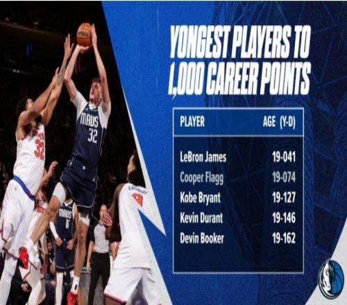 弗拉格因傷缺席8場(chǎng)后復(fù)出,他達(dá)成生涯1000分里程碑,且只有19歲74天創(chuàng)歷史第二年輕紀(jì)錄,僅次于詹姆斯19歲41天,超越科比19歲127天、杜蘭特19歲146天、布克19歲162天。