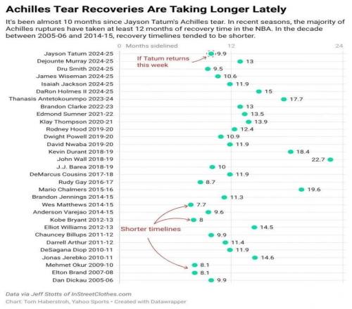 2016年之后,球員、球隊對待跟腱傷病都更加謹慎,因此復出耗時基本在10個月以上,平均達到了13個月,其中恢復最好的杜蘭特足足花了18.4個月,超過一年半時間。