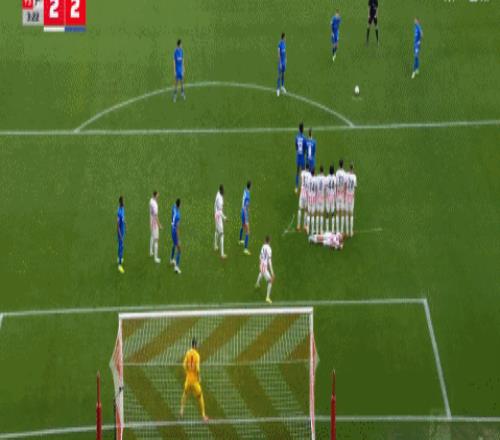 第45+3分鐘,格里馬爾多前場定位球直接破門,勒沃庫森2-2