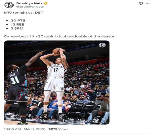 這場比賽小邁克爾-波特39分鐘,25中10,三分12中3,罰球7中7,拿到30分13籃板1助攻2搶斷1蓋帽,他已經(jīng)第11場比賽完成20+10的數(shù)據(jù)。
